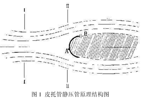 皮托管的測量原理是基于伯努利方程在空氣中應(yīng)用的一個實(shí)例,如圖1所示。當(dāng)理想流體均勻的平行流向靜止物體時,設(shè)想其中一條撞在物體上(即圖1中的A點(diǎn)),在此處流體發(fā)生分岔,A點(diǎn)成為滯止或駐點(diǎn),A的流速為零,V-A=0。