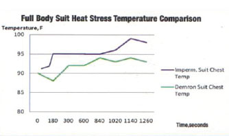 實驗條件:工作人員身穿不同防護服,以3.5英里/小時的速度在跑步機上慢跑10分鐘后測量全身防護服的溫度。藍色曲線代表通用防護服,綠色曲線代表使用Demron材料制成的防護服。